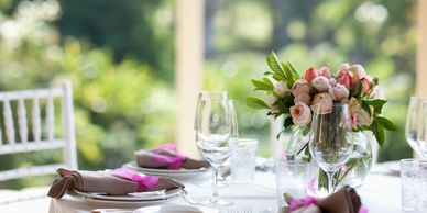 Thrift stores have beautiful vases and containers often donated by a just married couple. Flowers purchased at a supermarket are long lasting. Try craft stores for ideas.